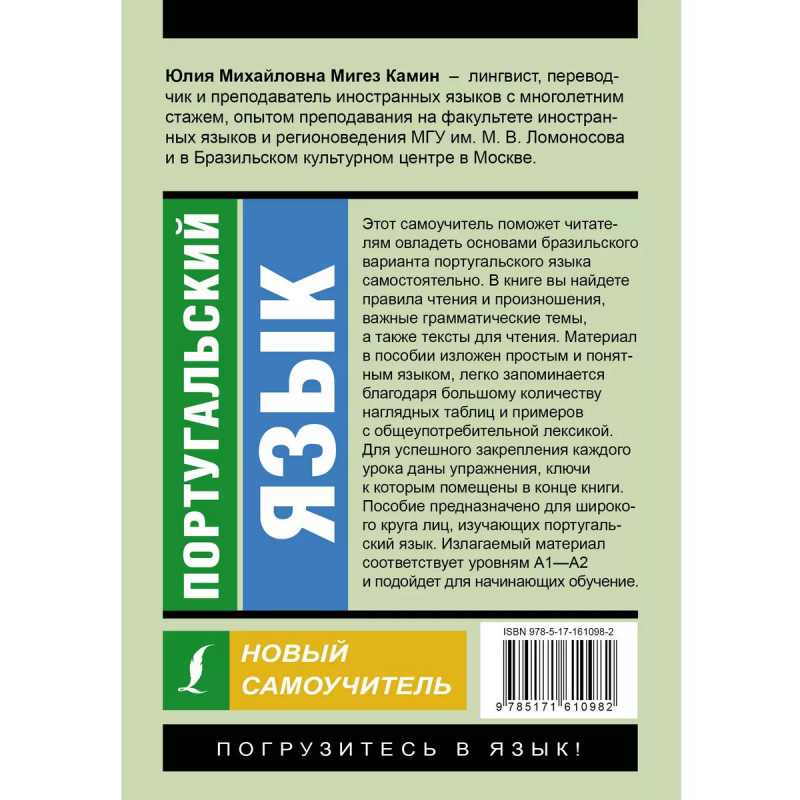 Португальский язык. Новый самоучитель. Юлия Михайловна Мигез Камин - лингвист, переводчик и преподаватель иностранных языков с многолетним стажем, опытом преподавания на факультете иностранных языков и регионоведения МГУ им. М. В. Ломоносова и в Бразильском культурном центре в Москве. В книге вы найдете правила произношения, важные грамматические темы, а также тексты для чтения. Материал в пособии изложен простым и понятным языком, легко запоминается благодаря большому количеству наглядных таблиц и примеров с общеупотребительной лексикой. Для успешного закрепления каждого урока даны упражнения, ключи к которым помещены в конце книги. Пособие предназначено для широкого круга лиц, изучающих португальский язык, особенно для тех, кто решил овладеть бразильским вариантом португальского языка самостоятельно. Излагаемый материал соответствует уровням А1-А2 и подойдет для начинающих обучение.