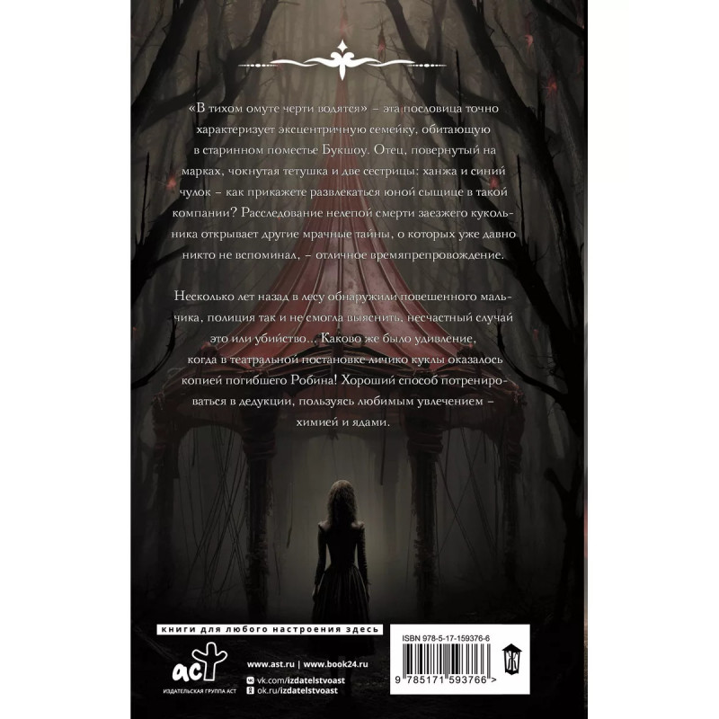 Сорняк, обвивший сумку палача. "В тихом омуте черти водятся" - эта пословица точно ха- рактеризует эксцентричную семейку, обитающую в старинном поместье Букшоу. Отец, повернутый на марках, чокнутая тетушка и две сестрицы: ханжа и синий чулок - как прикажете развлекать- ся юной сыщице в такой компании? Расследование нелепой смерти заезжего кукольника откры- вает другие мрачные тайны, о которых уже давно никто не вспо- минал - отличное время препровождение. Несколько лет назад в лесу обнаружили повешенного маль- чика, полиция так и не смогла выяснить, несчастный случай это или убийство Каково же было удивление, когда в театральной по- становке личико куклы оказалось копией погибшего Робина! Хо- роший способ потренироваться в дедукции, пользуясь любимыми увлечениями - химией и ядами.