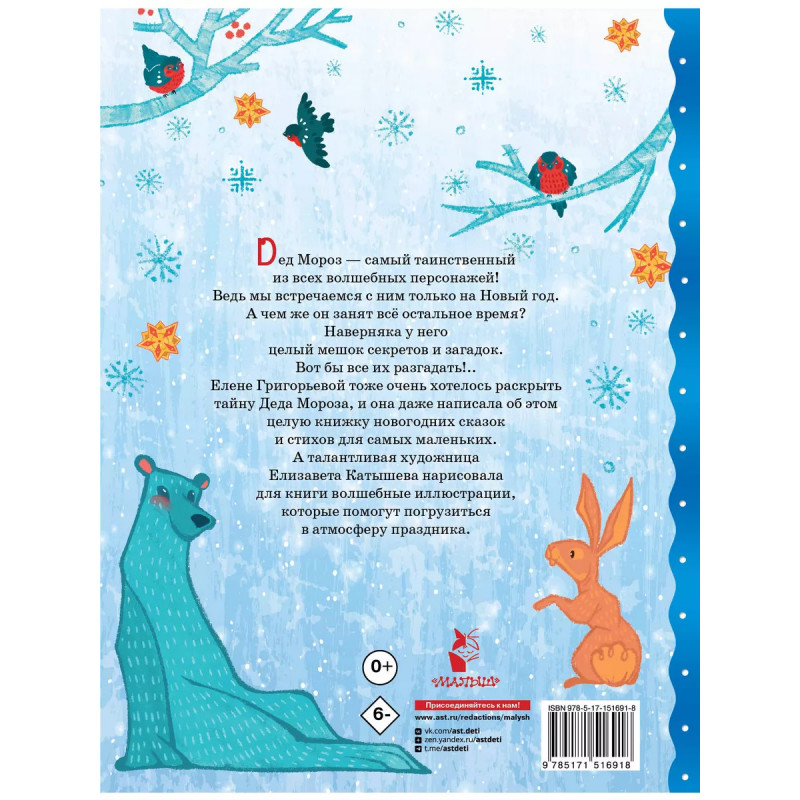 Тайна Деда Мороза. Сказки и стихи. Дед Мороз - самый таинственный из всех волшебных персонажей! Ведь мы встречаемся с ним только на Новый год. А чем же он занят всё остальное время? Наверняка у него целый мешок секретов и загадок. Вот бы все их разгадать!.. Елене Григорьевой, автору этой книжки, тоже очень хотелось раскрыть тайну Деда Мороза, и она даже написала об этом целую книжку новогодних сказок и стихов для самых маленьких. А талантливая художница Елизавета Катышева нарисовала для книги волшебные иллюстрации, которые помогут погрузиться в атмосферу праздника.