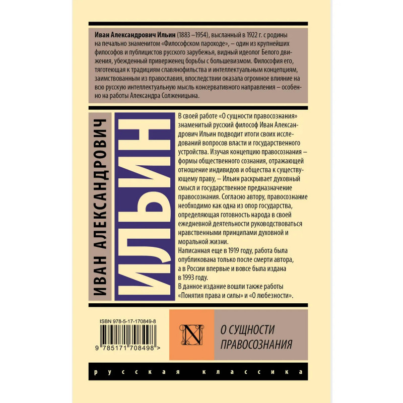 — Иван Александрович Ильин — выдающийся русский философ. — В своей работе «О сущности правосознания» знаменитый русский философ Иван Александрович Ильин подводит итоги своих исследований вопросов власти и государственного устройства. — Вопросы, поднятые автором в работе «О сущности правосознания», остаются актуальными и сегодня. — Написанная еще в 1919 году, работа была опубликована только после смерти автора, а в России впервые и вовсе была издана в 1993 году. — В данное издание вошли также работы «Понятия права и силы» и «О любезности». — Издание в серии «Эксклюзив: Русская классика» — в удобном карманном формате и узнаваемом оформлении.