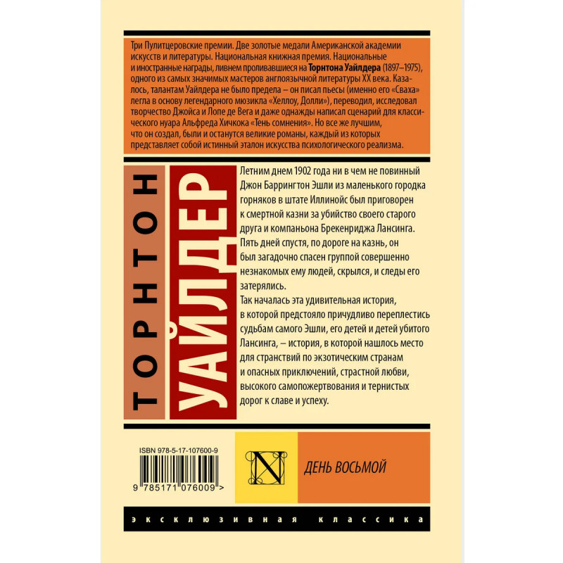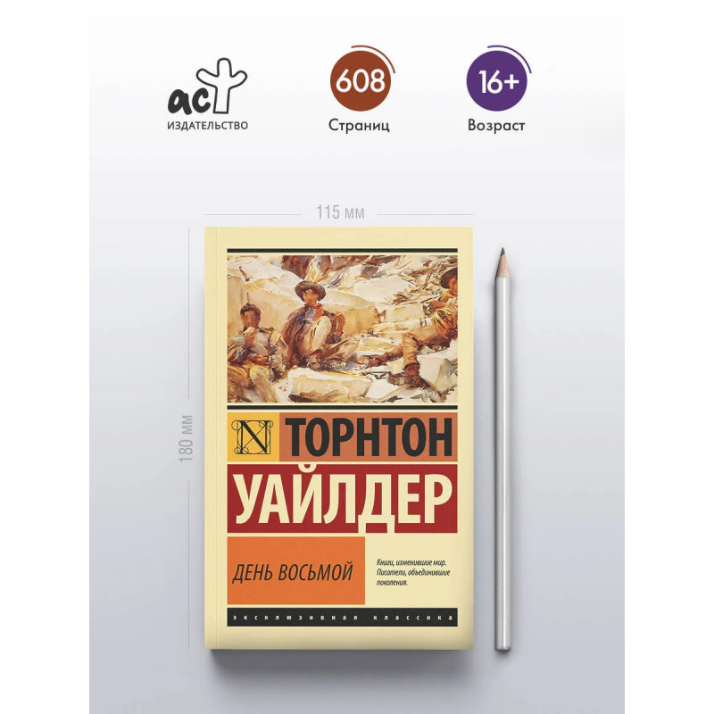 — От автора романов «Мартовские иды» и «Мост короля Людовика Святого». — Писатель, драматург и сценарист Торнтон Уайлдер — трехкратный обладатель Пулитцеровской премии и один из самых значимых американских авторов середины XX века. — Вышедший в 1967 году роман «День восьмой» завоевал Национальную книжную премию. Критики признали трогательное и захватывающее повествование «великим американским эпосом». — Издание в серии «Эксклюзивная классика» — в удобном карманном формате и узнаваемом оформлении.