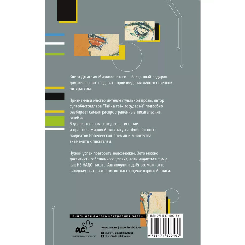 Как не надо писать. От пролога до кульминации. Антикоучинг - бесценный подарок для желающих создавать произведения художественной литературы. Тысячи литературных коучей предлагают схемы: как НАДО писать, следуя за успешными авторами. Но ни один коуч не написал ни одного бестселлера, и ни один бестселлер в мире не написан по их шаблонам. Дмитрий Миропольский - признанный мастер интеллектуальной прозы, автор историко-приключенческих романов-бестселлеров - подробно разбирает самые распространённые писательские ошибки. В его книге, построенной по законам классической драматургии, обобщён опыт множества знаменитых российских и зарубежных писателей, включая лауреатов Нобелевской премии... ...а главное, увлекательный экскурс в историю и практику мировой литературы показывает, что невозможно повторить чужой успех. Зато можно достигнуть собственного успеха, если научиться тому, как НЕ НАДО писать. Антикоучинг даёт каждому возможность стать автором по-настоящему хорошей книги.