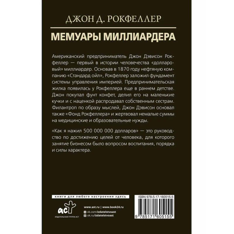 Мемуары миллиардера. Американский предприниматель Джон Дэвисон Рокфеллер - первый в истории человечества "долларовый" миллиардер. Основав в 1870 году нефтяную компанию "Стандард ойл", Рокфеллер заложил фундамент системы управления империей. Предпринимательская жилка появилась у Рокфеллера еще в раннем детстве. Джон покупал фунт конфет, делил его на маленькие кучки и с наценкой распродавал собственным сестрам. Филантроп по образу мыслей, Джон Дэвисон основал также "Фонд Рокфеллера" и жертвовал немалые суммы на медицинские и образовательные нужды. "Как я нажил 500 000 000 долларов" - это руководство по достижению целей от человека, для которого занятие бизнесом было вопросом воспитания, порядка и силы характера.