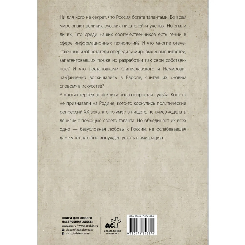 Ни для кого не секрет, что Россия богата талантами. Во всем мире знают великих русских писателей и ученых. Но знали ли вы, что среди наших соотечественников есть гении в сфере информационных технологий? И что многие отечественные изобретатели опередили мировых знаменитостей, запатентовавших позже их разработки как свои собственные? И что постановками Станиславского и Немировича-Данченко восхищались в Европе, считая их "новым словом" в искусстве? У многих героев этой книги была непростая судьба. Кого-то не признавали на Родине, кого-то коснулись политические репрессии ХХ века, кто-то умер в нищете, не сумев "сделать деньги" с помощью своего таланта. Но объединяет их всех одно — безусловная любовь к России, не ослабевавшая даже у тех, кто был вынужден уехать в эмиграцию.