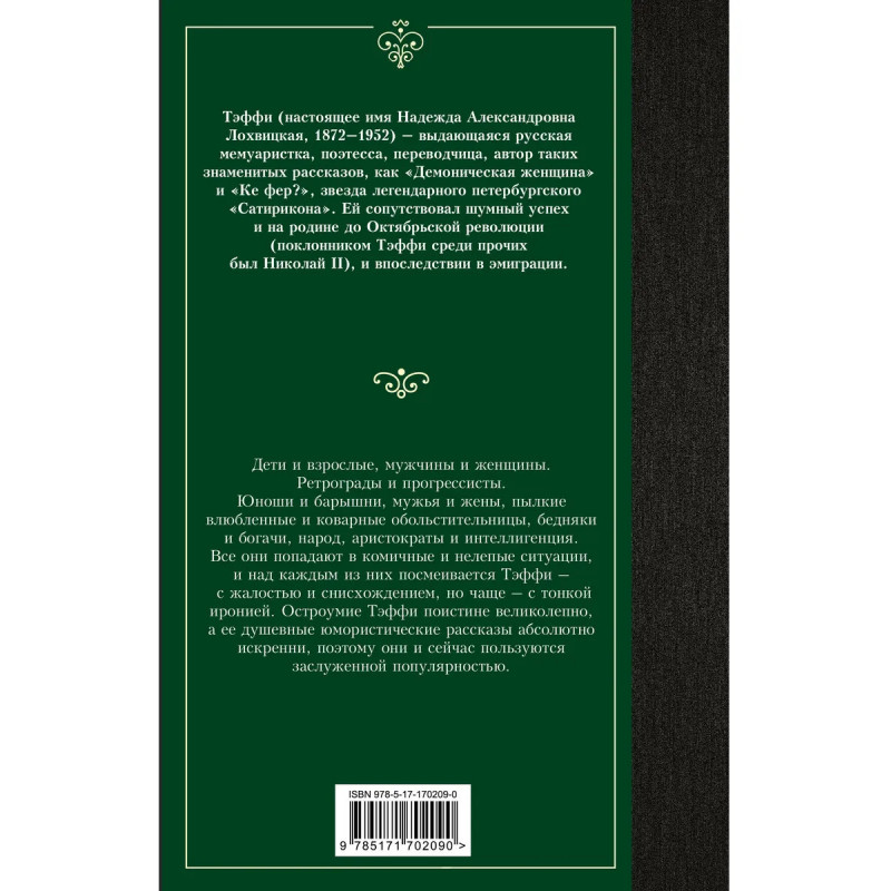 — Надежда Александровна Лохвицкая, также известная как Тэффи — известная поэтесса, прозаик, переводчик и мемуарист. Она писала сатирические стихотворения и фельетоны, очерки о «русском» Париже и воспоминания о представителях русского модерна, ее называли «королевой» русского юмора. — Остроумие Тэффи поистине великолепно, а ее душевные юмористические рассказы абсолютно искренни, поэтому они и сейчас пользуются заслуженной популярностью. — Сборник комичных и нелепых ситуаций, в которые попадают юноши и барышни, пылкие влюбленные и коварные обольстительницы, бедняки и богачи.