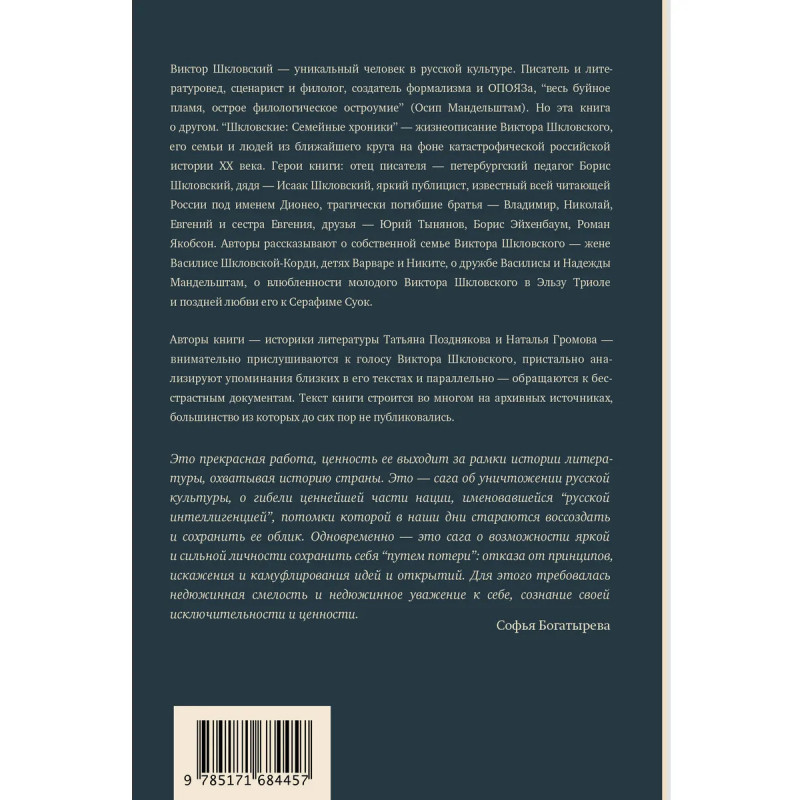 - Как идеолог ОПОЯЗа, выдающийся филолог, «весь буйное пламя, острое филологическое остроумие» Виктор Шкловский смог пережить неспокойный XX век? Какими были его семья, его романтическая жизнь, его манера дружить? Об этом рассказывает новая биография. - Личность Шкловского показана в книге через призму его отношений с близкими. И все же эта история — нечто большее. «Это – сага об уничтожении русской культуры, о гибели ценнейшей части нации, именовавшейся «русской интеллигенцией». Одновременно — это сага о возможности яркой и сильной личности сохранить себя. Для этого требовалась недюжинная смелость и недюжинное уважение к себе, сознание своей исключительности и ценности» — пишет Софья Богатырева. - Издание основано на архивных данных, которые ранее не публиковались. - Об авторах: Наталья Громова — писатель, историк литературы, автор множества книг о культуре XX века. Татьяна Позднякова — историк литературы и искусствовед, известная исследованиями жизни и творчества Анны Ахматовой.