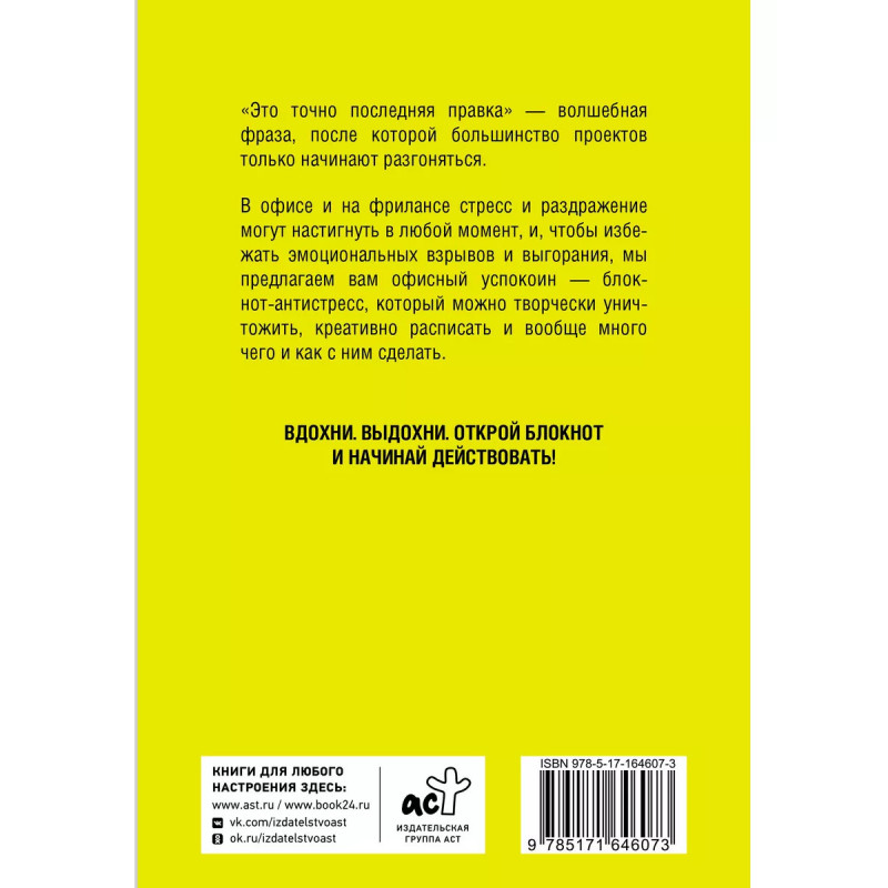 "Это точно последняя правка" волшебная фраза, после которой большинство проектов только начинают разгоняться. В офисе и на фрилансе стресс и раздражение могут настигнуть в любой момент, и, чтобы избежать эмоциональных взрывов и выгорания, мы предлагаем вам офисный успокоин блокнот-антистресс, который можно творчески уничтожить, креативно расписать и вообще много чего и как с ним сделать.