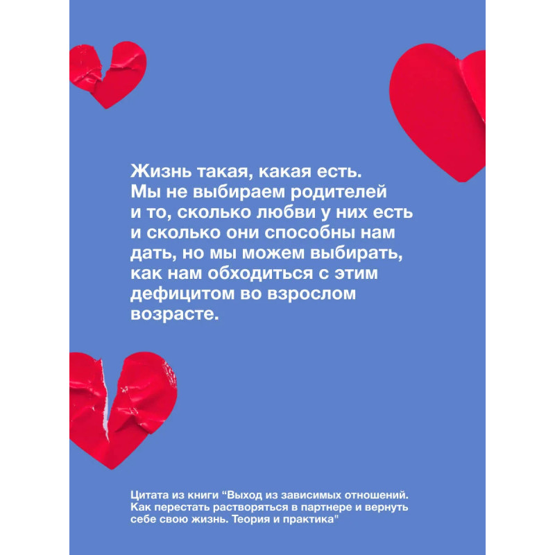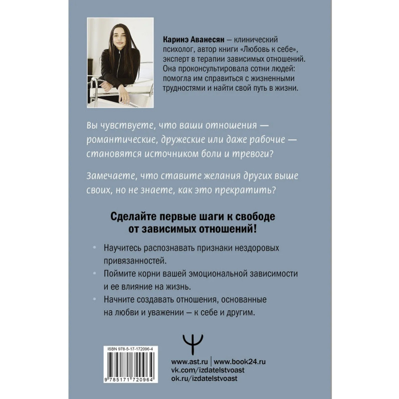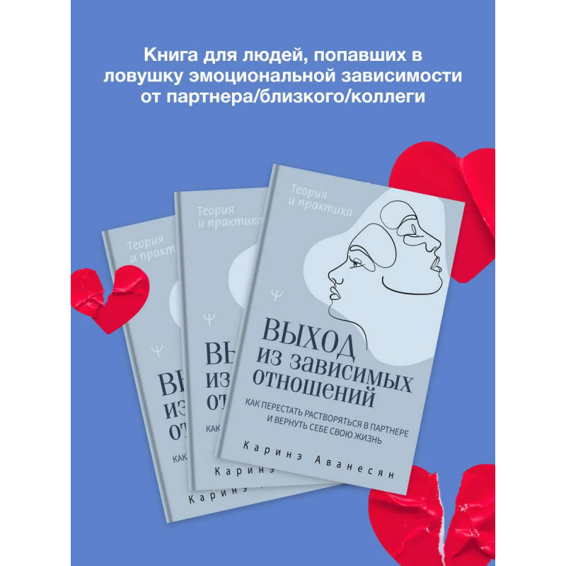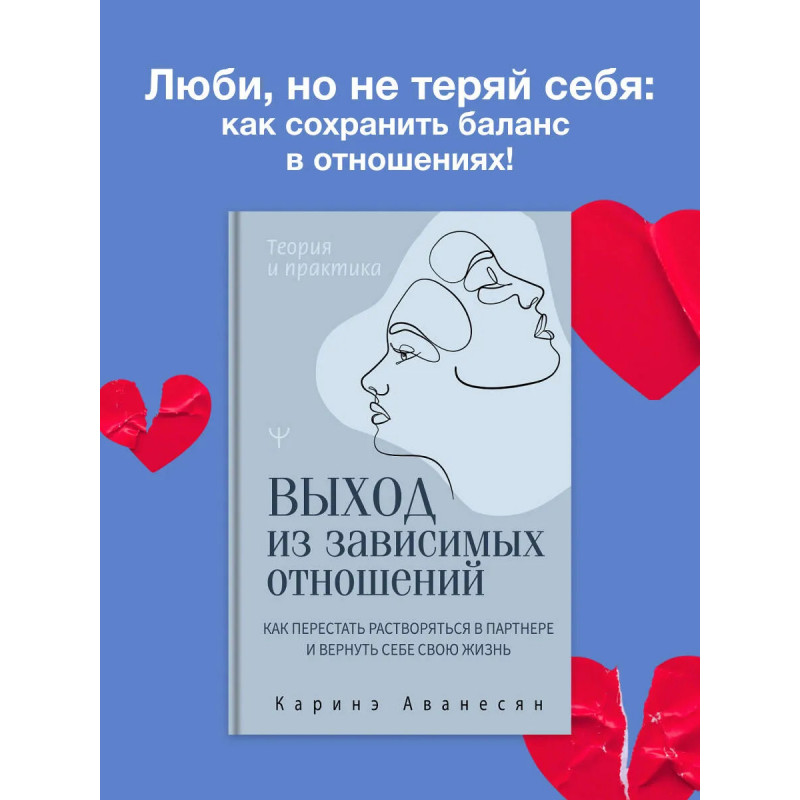 Вы чувствуете, что ваши отношения — романтические, дружеские или даже рабочие — становятся источником боли и тревоги? Замечаете, что ставите чужие желания выше своих, но не знаете, как это прекратить? Возможно, вы оказались в ситуации эмоциональной зависимости. Эта книга — поддержка в непростом, но освобождающем путешествии от зависимых отношений. Каринэ Аванесян — психолог с многолетним опытом работы —помогает понять, как формируется подобная зависимость и почему мы попадаем в эту ловушку. Вместе с автором вы научитесь распознавать признаки нездоровых привязанностей, понимать корни эмоциональной зависимости и ее влияние на вашу жизнь, узнаете, как освободиться от боли и сформировать здоровые границы, а также построить отношения, основанные на любви и уважении — к себе и другим. Практические советы, примеры из реальной жизни и упражнения помогут вам сделать первые шаги к свободе. Вы заслуживаете быть счастливыми — начните этот путь уже сегодня!