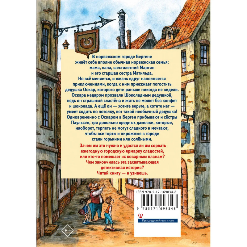 «Шоколадный дедушка» — сказочная повесть о приключениях маленьких брата и сестры Мартина и Матильды и их дедушки Оскара, экстравагантного весельчака и большого любителя сладостей. Дети пытаются помешать коварным сёстрам Паульсен, которые хотят сорвать ежегодную Ярмарку сладостей и уничтожить все сладости в мире. Книга снабжена новыми цветными иллюстрациями известной художницы Ирины Петелиной.