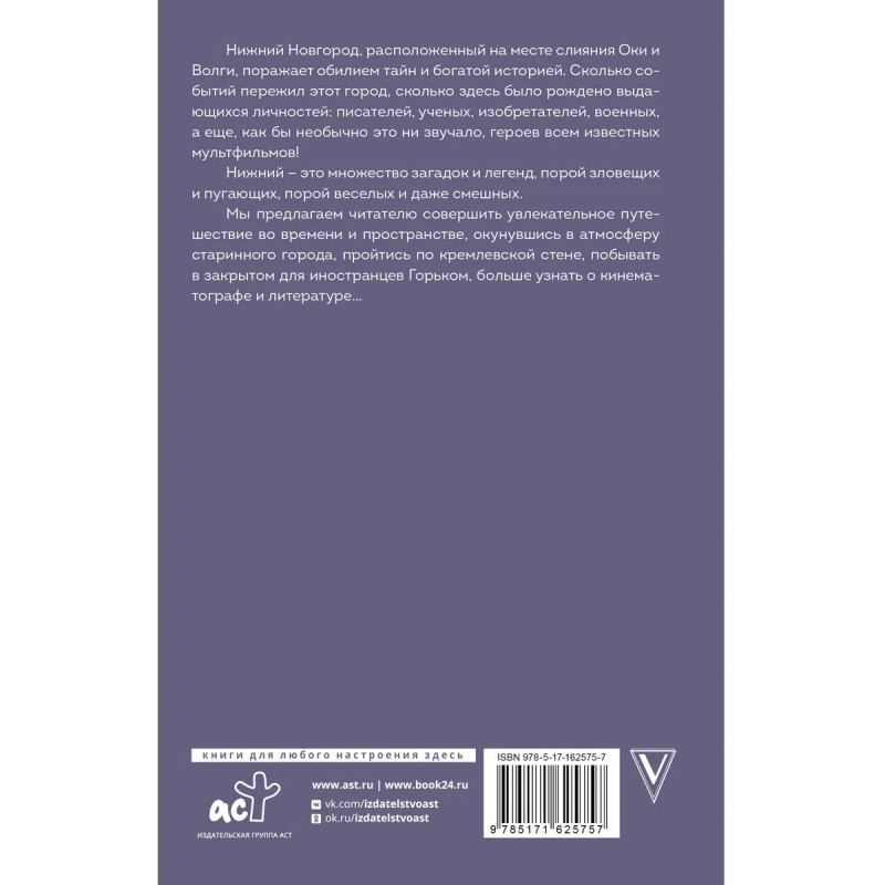 Нижний Новгород, расположенный на месте слияния Оки и Волги, поражает обилием тайн и богатой историей. Сколько событий пережил этот город, сколько здесь было рождено выдающихся личностей: писателей, ученых, изобретателей, военных, а еще, как бы необычно это ни звучало, героев всем известных мультфильмов! Нижний – это множество загадок и легенд, порой зловещих и пугающих, порой веселых и даже смешных. Мы предлагаем читателю совершить увлекательное путешествие во времени и пространстве, окунувшись в атмосферу старинного города, пройтись по кремлевской стене, побывать в закрытом для иностранцев Горьком, больше узнать о кинематографе и литературе…