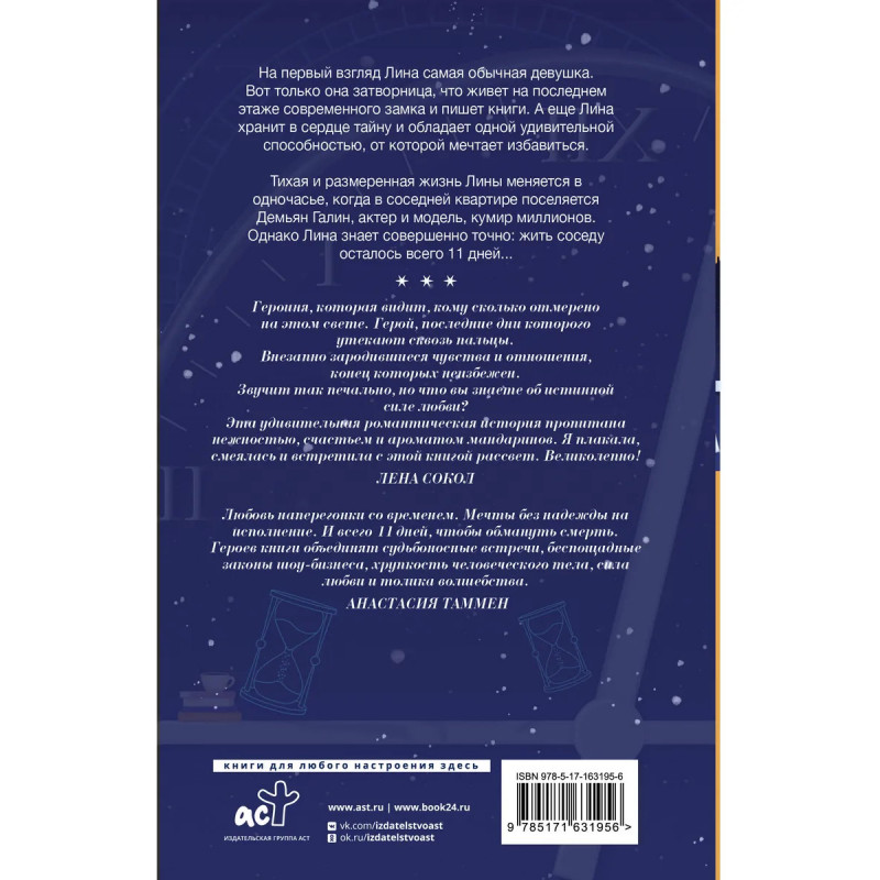 Детективный любовный роман от автора бестселлера Школа на краю света. Главная героиня обладает суперспособностью, которая разрушает ее жизнь. Чтобы не видеть, когда умрут люди вокруг, она спряталась от мира. История о принятии себя, борьбе со страхами и о смелости любить человека, которому осталось жить всего несколько дней. Вместе с героями популярным актером и простой писательницей загляните за кулисы шоу-бизнеса и писательской кухни. Книга с атмосферой дорамы в российских реалиях.