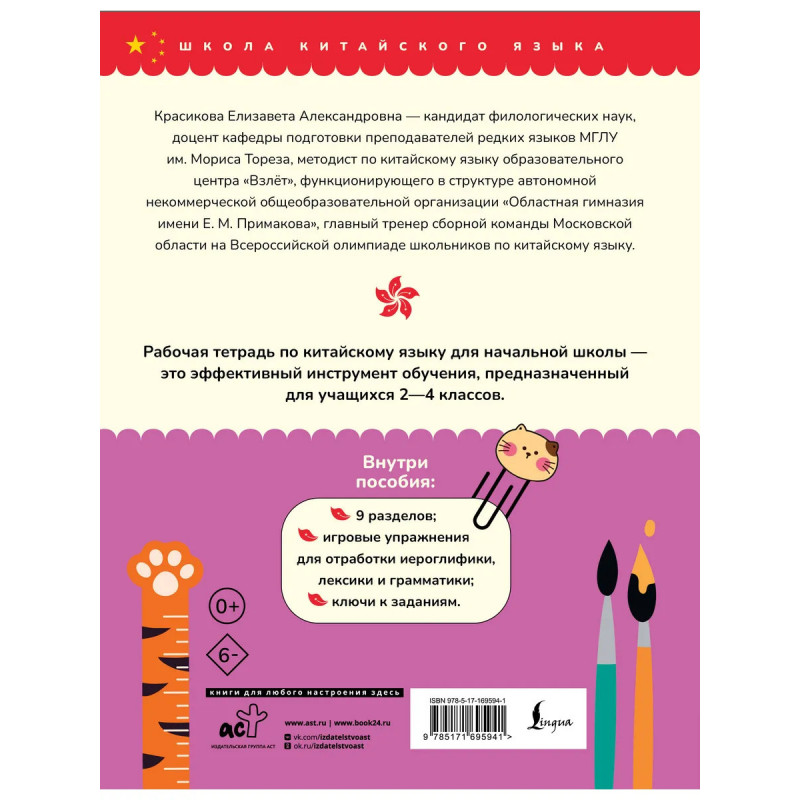 Красикова Елизавета Александровна — кандидат филологических наук, доцент кафедры подготовки преподавателей редких языков МГЛУ им. Мориса Тореза, методист по китайскому языку образовательного центра "Взлёт", функционирующего в структуре автономной некоммерческой общеобразовательной организации "Областная гимназия имени Е. М. Примакова", главный тренер сборной команды Московской области на Всероссийской олимпиаде школьников по китайскому языку. Рабочая тетрадь по китайскому языку для начальной школы — это эффективный инструмент обучения, предназначенный для учащихся 2—4 классов. В ней представлены игровые упражнения, способствующие развитию навыков письма, запоминанию порядка написания черт в иероглифах, а также изучению новых слов и выражений. Красочные иллюстрации и удобный формат делают процесс обучения интересным и увлекательным для детей. Эта рабочая тетрадь подходит для учеников начальной школы, учителей и родителей и может использоваться как на уроках, так и для дополнительных занятий.