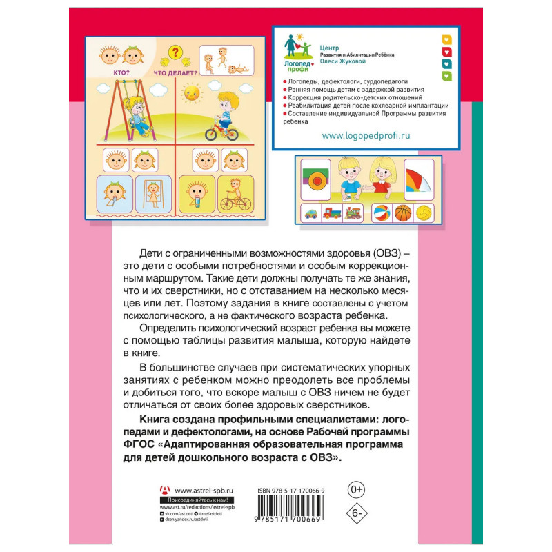 Книга предназначена для детей с ограниченными возможностями здоровья (ОВЗ), которые имеют особые потребности и нуждаются в особом коррекционном маршруте. Такие дети должны получать те же знания, что и их сверстники, но с отставанием на несколько месяцев или лет. Поэтому задания в книге составлены с учетом психологического, а не фактического возраста ребенка. Заниматься по книге смогут как нормотипичные дети в возрасте от 3 до 4,5 лет, так и дети с ОВЗ, чей фактический возраст выше (5–6 лет), а психологический соответствует 3–4,5 годам. Определить психологический возраст ребенка вы сможете с помощью таблицы развития малыша, которую найдете в книге. В большинстве случаев при систематических упорных занятиях можно преодолеть все проблемы и добиться того, что вскоре малыш с ОВЗ ничем не будет отличаться от своих более здоровых сверстников. Для детей с задержкой развития. Соответствует требованиям ФГОС.