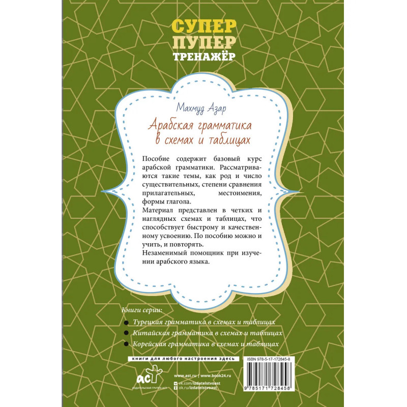 Пособие содержит базовый курс арабской грамматики. Рассматриваются такие темы, как род и число существительных, степени сравнения прилагательных, местоимения, количественные и порядковые числительные, формы глагола. Материал представлен в четких и наглядных схемах и таблицах, что способствует быстрому и качественному усвоению. По пособию можно учить и повторять. Издание предназначено для всех, кто учит арабский язык.