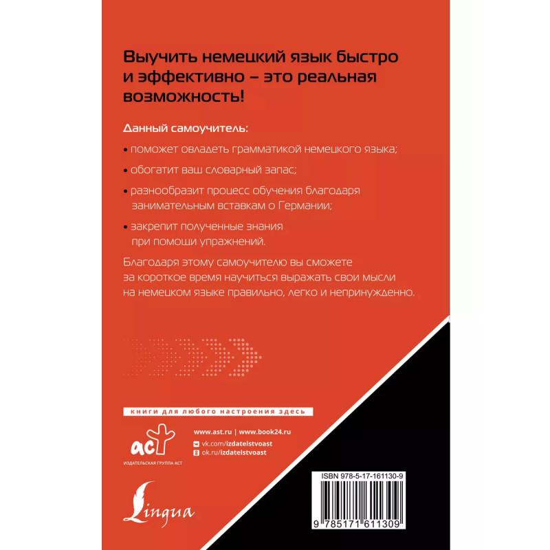 Немецкий язык. Лучший самоучитель для начинающих. Наталия Александровна Ганина - известный автор пособий по немецкому языку для взрослых. Данный самоучитель предназначен для интенсивного обучения немецкому языку - устной речи, чтению, пониманию и общению. Книга состоит из тематических разделов, которые охватывают лексику по важнейшим бытовым темам. Теоретическая часть сопровождается тестами, которые способствуют закреплению изученного на практике. Для проверки правильности их выполнения в конце книги даны ключи. Пособие также содержит полезную страноведческую информацию о Германии, кулинарный словарик и список сильных и неправильных глаголов. Самоучитель предназначен для широкого круга читателей, интересующихся изучением немецкого языка. Это издание идеально подходит для самостоятельного повторения материала и быстрого восстановления знаний.