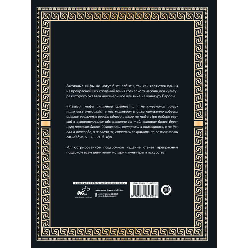 Античные мифы не могут быть забыты, так как являются одним из прекраснейших созданий гения греческого народа, вся культура которого оказала неизмеримое влияние на культуру Европы. "Излагая мифы античной древности, я не стремился исчерпать весь имеющийся у нас материал и даже намеренно избегал давать различные версии одного и того же мифа. При выборе версий я останавливался обыкновенно на той, которая более древнего происхождения. Источники, которыми я пользовался, я не давал в переводе, а излагал их, стараясь сохранить по возможности самый дух их…" — Н. А. Кун Иллюстрированное подарочное издание станет прекрасным подарком всем ценителям истории, культуры и искусства.