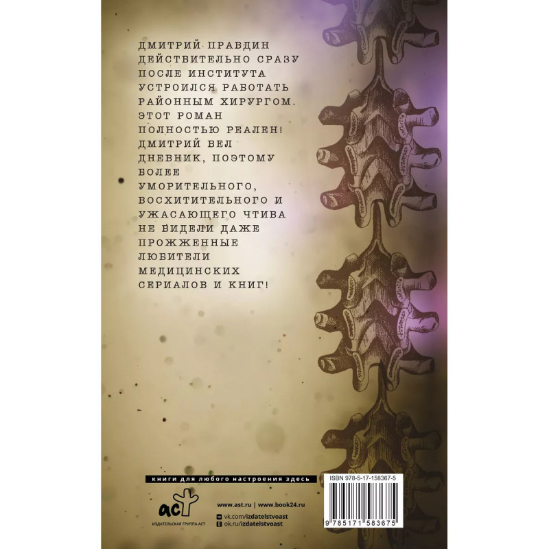 Записки районного хирурга. Дмитрий Правдин действительно сразу после института устроился работать районным хирургом. Этот - роман полностью реален! Дмитрий вел дневник, поэтому более уморительного, восхитительного и ужасающего чтива не видела даже прожженные любители медицинских сериалов и книг!