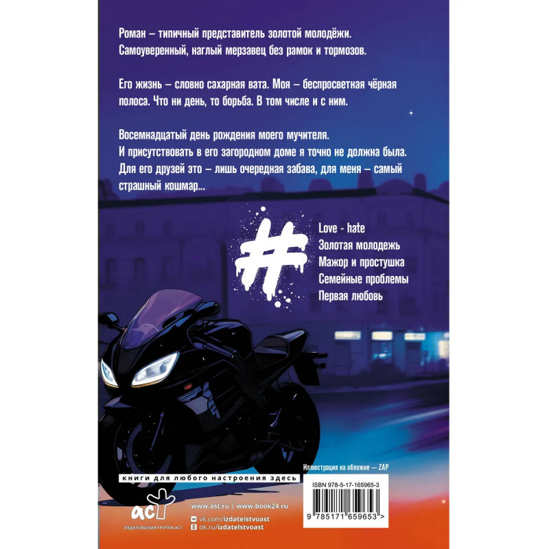 - Романтика в лучших традициях мирового new adult, книг Эрин Уатт и Моны Кастен, в российских реалиях. - Яркий и неоднозначный молодежный роман о всепоглощающей первой любви и тернистом пути к счастью. Мажор и простушка, элитная школа, экстрим, мотоциклы, проблемы с адаптацией в обществе и криминал. Красивая любовная история с надрывом и одновременно закрученный экшен с элементами триллера. - Книги Анны Джолос набирают миллионы прочтений в Сети. Этот роман ее дебют в бумаге. - Первый том дилогии. - Серия ALL IN. Любовь без компромиссов динамичный new adult с яркой любовной линией.