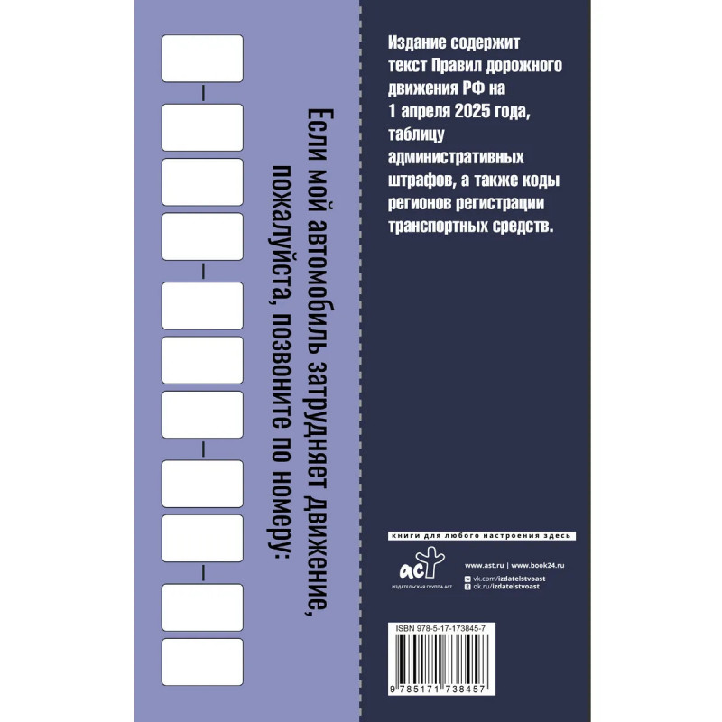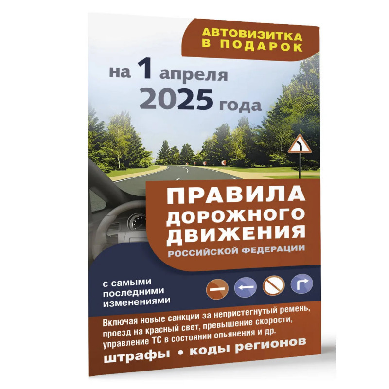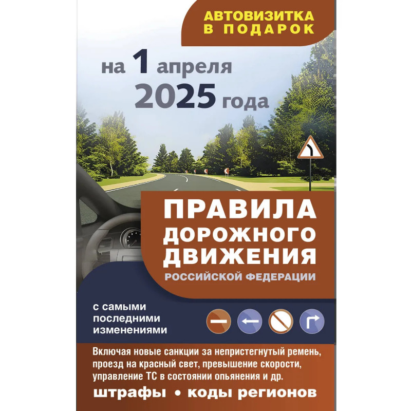 Книга содержит официальный текст Правил дорожного движения Российской Федерации со всеми изменениями и дополнениями на 1 апреля 2025 года. В цветной вкладке наглядно представлены все действующие дорожные знаки. Пособие содержит: - удобную таблицу административных штрафов за нарушение ПДД, в том числе новые штрафы за превышение скорости, непристегнутый ремень, проезд на красный свет и др.; - расширенный перечень неисправностей и условий, при которых запрещается эксплуатация транспортных средств; - автовизитку, которую можно вырезать и положить в салон автомобиля. Издание учитывает все изменения, опубликованные в официальных источниках на момент подписания издания в печать.