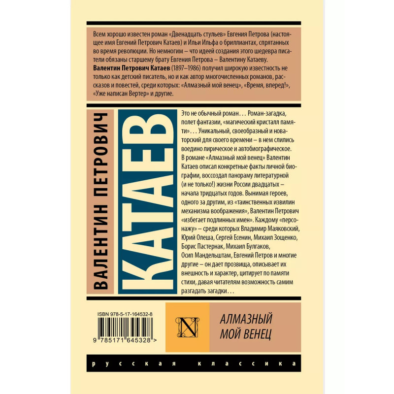 От автора романа Время, вперед! Советская литературная классика. Алмазный мой венец, центральное произведение в позднем этапе творчества Катаева, роман уникальный, своеобразный и новаторский для своего времени, текст, в котором воедино слились лирические и автобиографические элементы. Это книга, в которой Валентин Катаев приводит эпизоды из собственной биографии, широкими масками рисует панораму русской литературной жизни двадцатых годов XX века и делится множеством подробностей о многих известных писателях и поэтах, встреченных им за свою долгую и насыщенную жизнь. Среди героев книги естественно, под узнаваемыми псевдонимами Владимир Маяковский, Юрий Олеша, Сергей Есенин, Михаил Зощенко, Борис Пастернак, Михаил Булгаков, Осип Мандельштам и Евгений Петров.