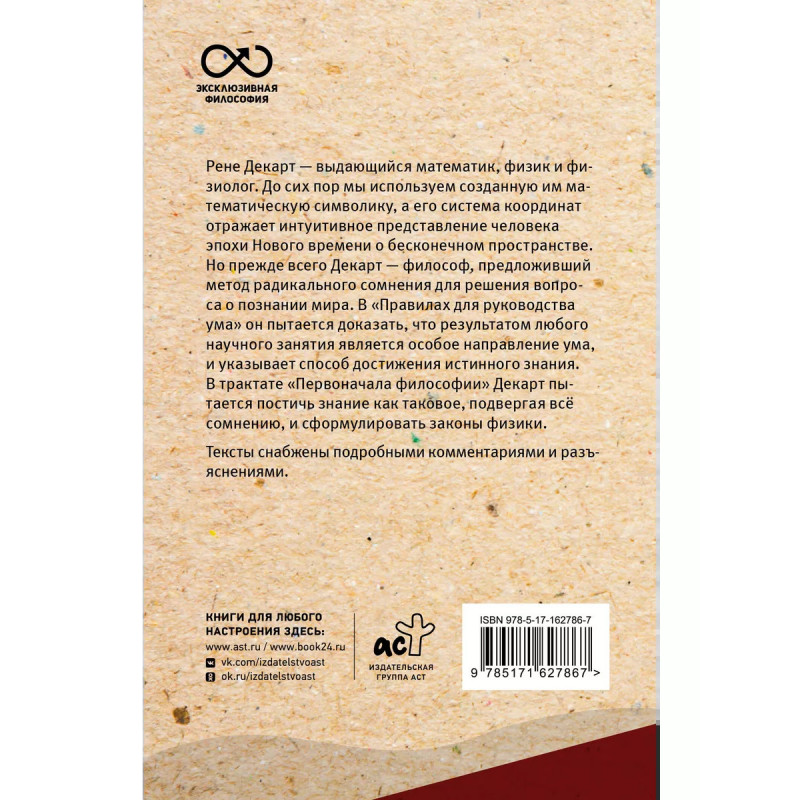 Рене Декарт выдающийся математик, физик и физиолог. До сих пор мы используем созданную им математическую символику, а его система координат отражает интуитивное представление человека эпохи Нового времени о бесконечном пространстве. Но прежде всего Декарт философ, предложивший метод радикального сомнения для решения вопроса о познании мира. В "Правилах для руководства ума" он пытается доказать, что результатом любого научного занятия является особое направление ума, и указывает способ достижения истинного знания. В трактате "Первоначала философии" Декарт пытается постичь знание как таковое, подвергая всё сомнению, и сформулировать законы физики. Тексты снабжены подробными комментариями и разъяснениями.