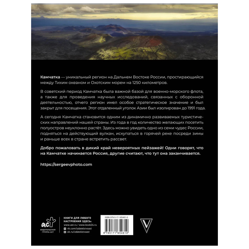 Знаете ли вы, какие тайны хранит загадочный полуостров Камчатка? Бывали ли вы когда-нибудь в Петропавловске-Камчатском? Гуляли по Природному парку «Ключевскому»? Может быть, вы видели Вилючинский вулкан или озеро Тайное? В издании «Камчатка – полуостров вулканов» вы найдете самые интересные и загадочные места полуострова Камчатка. Вас ждут грозные вулканы, пустынные пляжи, сопки и гейзеры, кратеры, ледники и лавовые пещеры. От величественной Ключевской Сопки до зеркальной глади озера Тайное в «Долине великанов», в котором отражаются снежные вершины вулкана Плоский Толбачик. В книге вы найдете не только интересные истории о природе Камчатки, но и атмосферные снимки удивительных мест. Каждая фотография – это мини-рассказ, переносящий нас на другой конец земли. В книге есть сведения об особенностях местного климата и экосистемах, растениях и животных. Откройте для себя загадочную и живописную Камчатку!