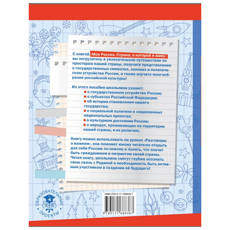 В пособии представлена информация о государственном устройстве, истории, культурном достоянии, народах и религиях России, а также о социальной политике, символах и субъектах Российской Федерации. Книга предназначена для младших школьников. Она поможет юным читателям понять, что значит быть гражданином и патриотом своей страны. Материалы можно использовать на уроках "Разговоры о важном".