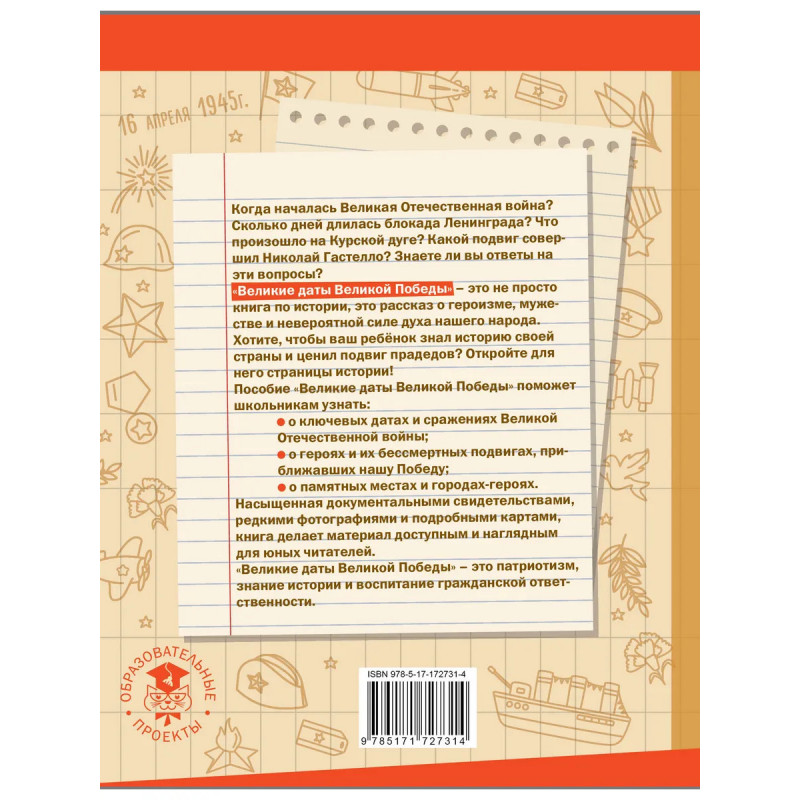 "Великие даты Великой Победы" – это не просто книга по истории, это рассказ о героизме, мужестве и невероятной силе духа нашего народа. Хотите, чтобы ваш ребёнок знал историю своей страны и ценил подвиг прадедов? Откройте для него страницы истории! Пособие "Великие даты Великой Победы" поможет школьникам узнать: • о ключевых датах и сражениях Великой Отечественной войны; • о героях и их бессмертных подвигах, приближавших нашу Победу; • о памятных местах и городах-героях. Насыщенная документальными свидетельствами, редкими фотографиями и подробными картами, книга делает материал доступным и наглядным для юных читателей. "Великие даты Великой Победы" – это патриотизм, знание истории и воспитание гражданской ответственности.