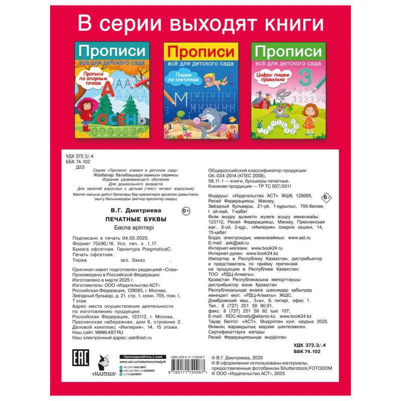 Вашему малышу скоро в школу? Тогда прописи «Печатные буквы» — лучший подарок будущему первокласснику! Они превратят учёбу в увлекательную игру. Прописи разработаны согласно ФГОС и с учётом всех физических и психоэмоциональных особенностей ребёнка. Плотная белая бумага, крупные клетки, цветные иллюстрации, образцы написания каждой печатной буквы и отработка их отдельных элементов, — всё это о нашей книге.