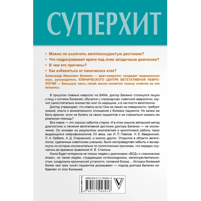 Александр Беленко - врач-невролог, кандидат медицинских наук, руководитель Клинического центра вегетативной неврологии - большую часть своей жизни посвятил поиску ответов на эти вопросы: - Как вылечить ВСД? - Как избавиться от панических атак раз и навсегда? Открытия и откровения врача-невролога: «Лечение ВСД возможно за счет собственных резервов организма - нам остается их только запустить».