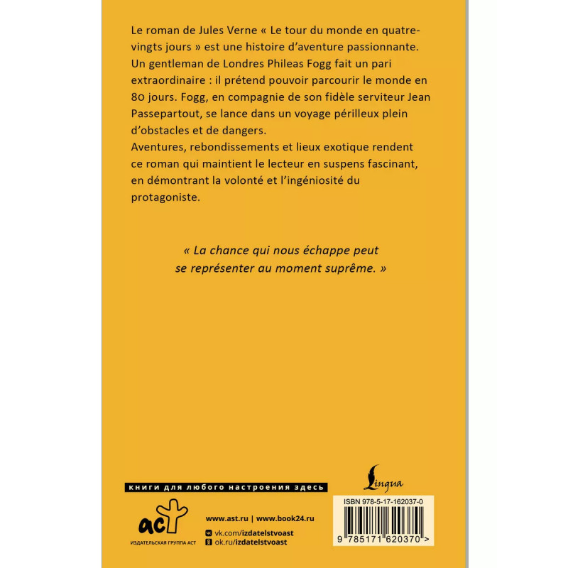 Роман Жюля Верна "Вокруг света за 80 дней" это захватывающая история о приключениях. Филеас Фогг, джентльмен из Лондона, заключает необычное пари: он утверждает, что сможет объехать весь мир за 80 дней. В компании своего верного слуги Жана Паспарту, Фогг отправляется в рискованное путешествие, полное всевозможных препятствий и опасностей. Приключения, неожиданные повороты сюжета и экзотические локации делают этот роман увлекательным и напряженным, демонстрируя силу воли и находчивость главного героя. Книга издана в неадаптированной версии на французском языке. Наслаждайтесь чтением шедевра мировой литературы в оригинале!