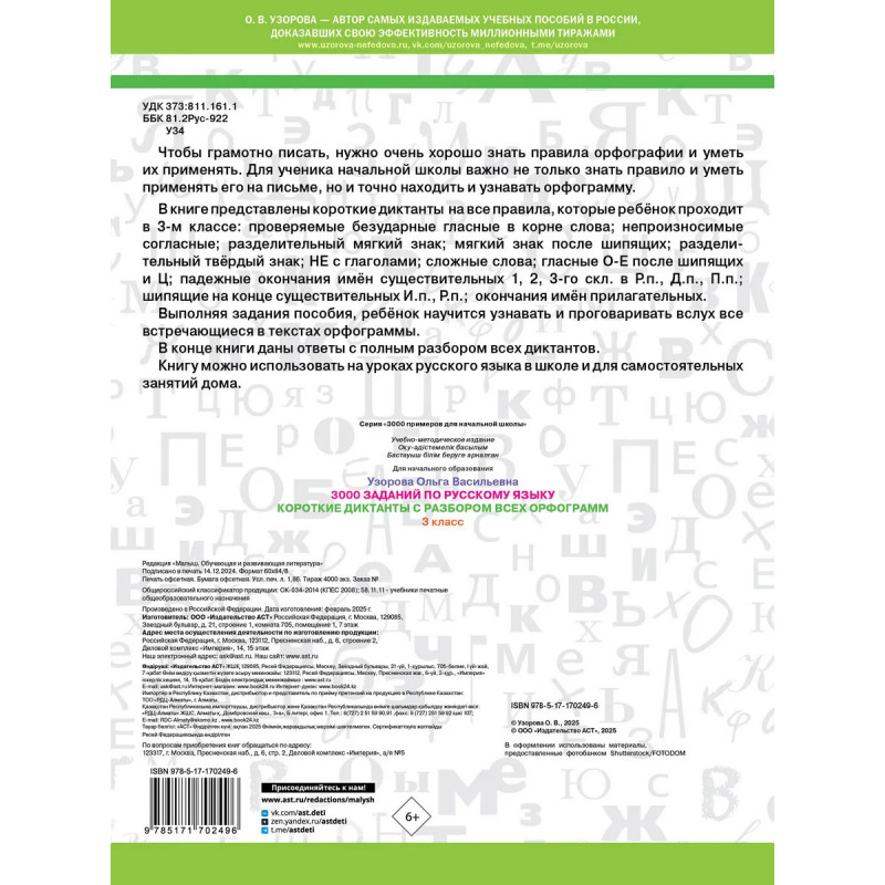 Для ученика начальной школы важно не только знать правило и уметь применять его на письме, но и точно находить и узнавать орфограмму. В книге представлены короткие диктанты на все правила, которые ребёнок проходит в 3 классе. Такие диктанты удобно использовать для быстрой проверки знаний, повторения, эффективного тренинга на каждом уроке. Выполняя задания пособия, ребёнок научится узнавать и проговаривать вслух все встречающиеся в текстах орфограммы, благодаря чему будет писать диктанты без ошибок. В конце книги даны ответы с полным разбором всех диктантов. Книгу можно использовать на уроках русского языка в школе и для самостоятельных занятий дома.