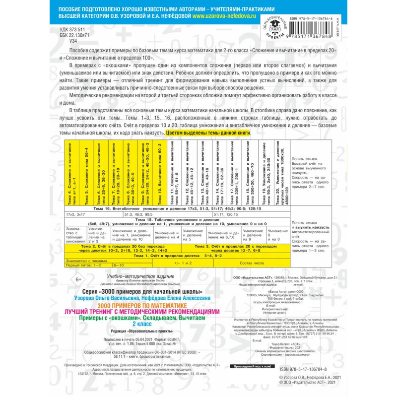 Пособие содержит примеры по базовым темам курса математики для 2 класса Сложение и вычитание в пределах 20 и Сложение и вычитание в пределах 100. В примерах с окошками пропущен один из компонентов сложения (первое или второе слагаемое) и вычитания (уменьшаемое или вычитаемое) или знак действия. Ребёнок должен определить, что пропущено в примере, и как это можно найти. Такие примеры отличный тренинг для формирования навыка выполнения устных вычислений, а также для развития умения устанавливать причинно-следственные связи при выборе способа решения. Методические рекомендации на второй и третьей сторонках обложки помогут эффективно организовать работу в классе и дома.