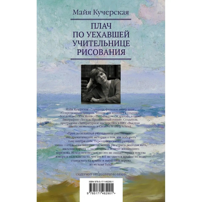 Майя Кучерская прозаик, филолог, автор книг "Современный патерик. Чтение для впавших в уныние", "Бог дождя", "Тётя Мотя", "Ты была совсем другой", а также биографии "Лесков. Прозёванный гений". Создатель программы "Литературное мастерство" в НИУ "Высшая школа экономики" и Creative Writing School. "Плач по уехавшей учительнице рисования" это драматические истории о том, как побороть тьму внутри себя. Персонажи самого разного толка студентка-эмигрантка, монах-расстрига, молодая мать, мальчик-сирота застигнуты в момент жизненного перелома. Исход неизвестен, но это не лишает героев чувства юмора и надежды на то, что им всё же удастся пройти по воде, станцевать на крыше и вырастить дерево из музыки Баха.