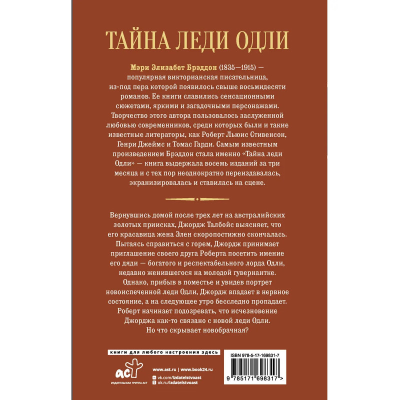 — «Тайна леди Одли» — новая книга серии «Викторианский бестселлер». В серии «Викторианский бестселлер» публикуются самые известные и популярные произведения викторианской эпохи. — Автор романа Мэри Элизабет Брэддон — одна из самых читаемых романисток викторианской эпохи, многие ее произведения были переведены на русский язык еще в XIX веке. — За свою долгую и плодотворную карьеру Брэддон написала свыше 75 книг, но самым известным ее произведением остается «Тайна леди Одли». Роман несколько раз экранизировался и адаптировался для театральной сцены.