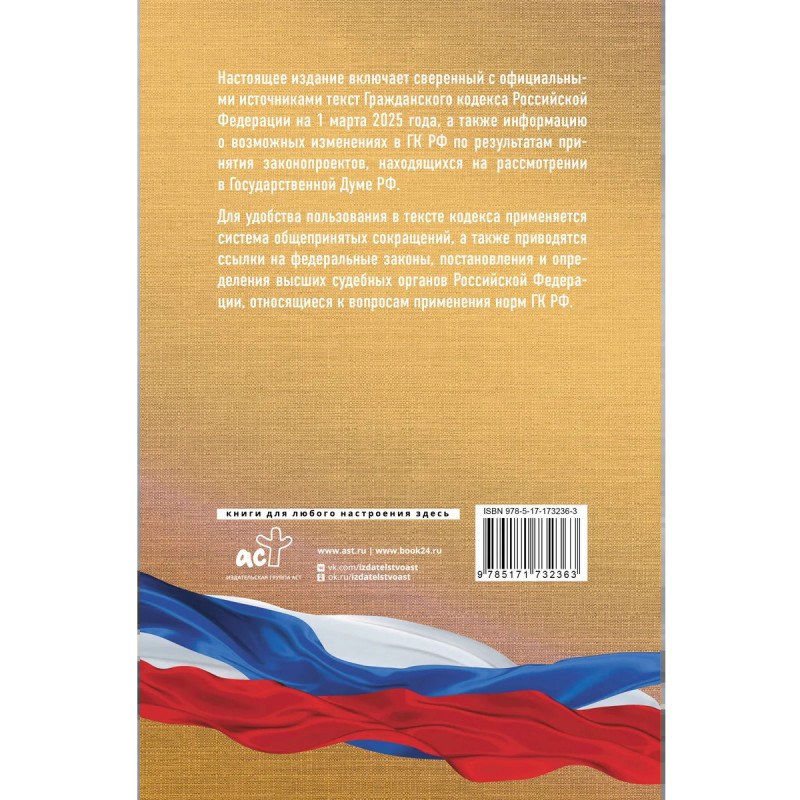 Данное издание Гражданского кодекса Российской Федерации сверено с официальным источником и приводится по состоянию на 1 марта 2025 года. Кодекс учитывает все изменения, опубликованные в официальных источниках на момент подписания издания в печать. В издании представлена информация о возможных изменениях в ГК РФ по результатам принятия законопроектов, находящихся на рассмотрении в Государственной Думе РФ. Для более удобного использования в тексте кодекса применяется система сокращенного написания отдельных слов и выражений, а также приводятся ссылки на федеральные законы, постановления и определения высших судебных органов Российской Федерации, относящиеся к вопросам применения норм гражданского права.