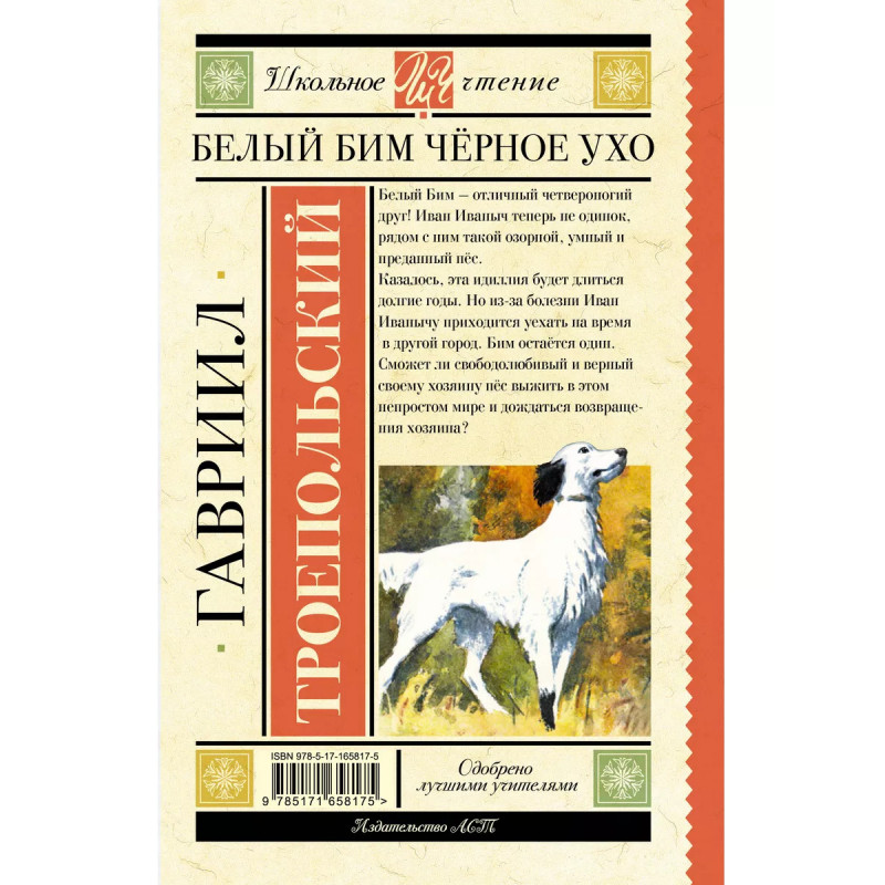 Повесть Гавриила Троепольского о собаке по имени Белый Бим и его мудром и добром хозяине раскрывает, насколько беззаветно преданными и доверчивыми могут быть братья наши меньшие. Биму повезло, такого хозяина, как у него, днём с огнём не сыщешь. Они и в правду стали настоящими друзьями: вместе идут на охоту, вместе смотрят в окно и думают каждый о своём. Но Биму предстоит пройти страшное испытание он, весёлый и доверчивый пёс, столкнётся с жестокими и равнодушными людьми. Для среднего школьного возраста.