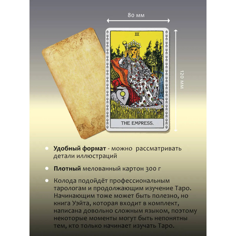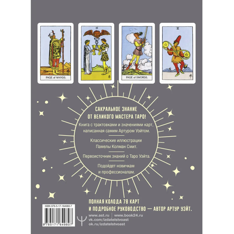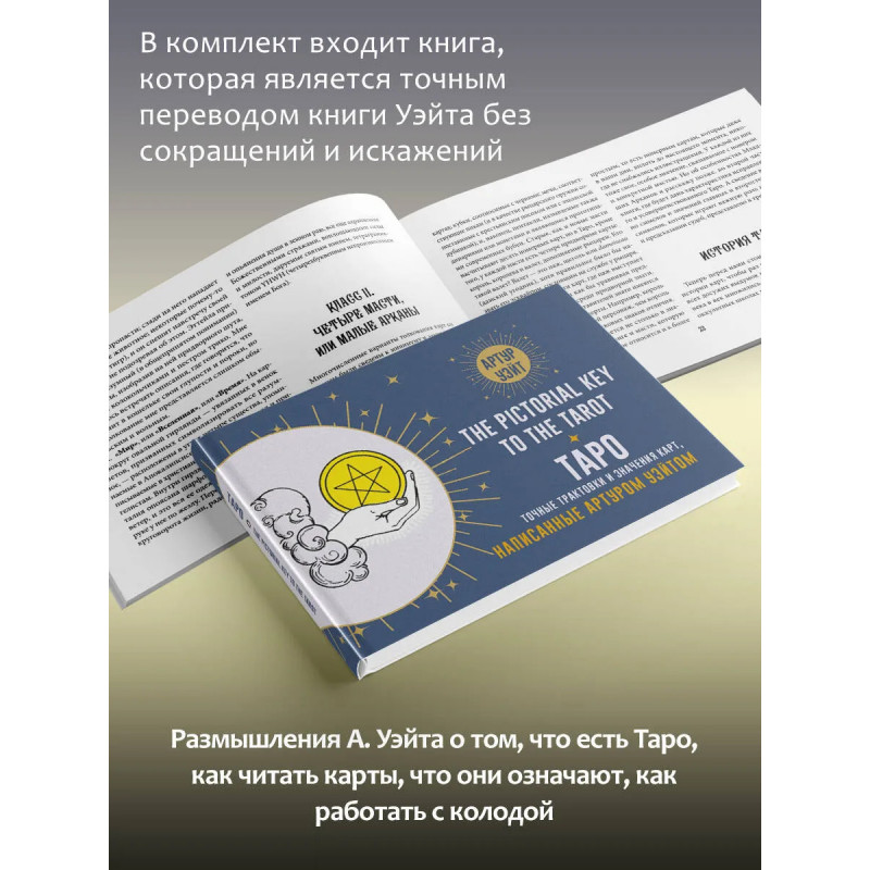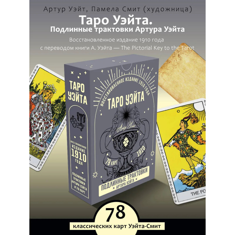 Перед вами — первоисточник! Первая книга о Таро от Артура Уэйта! Автор самой популярной колоды для гадания раскрывает главные идеи, заложенные им в карты. В подарочный комплект вошли: полная колода из 78 классических карт Памелы Колман Смит и книга, которая является точным переводом книги Уэйта без сокращений и искажений. Эта книга содержит единственное точное описание карт колоды, ведь оно сделано самим их создателем. Вы сможете лучше понять символику карт и по-другому взгляните на колоду, даже если давно работаете с ней. Колода подойдёт как начинающим, так и профессиональным тарологам. Понятый язык руководства доступно объяснит, как сделать даже самые сложные расклады. Колода также издается в формате малой коробки под названием "Подлинное Таро Уэйта. Руководство автора и 78 классических карт".