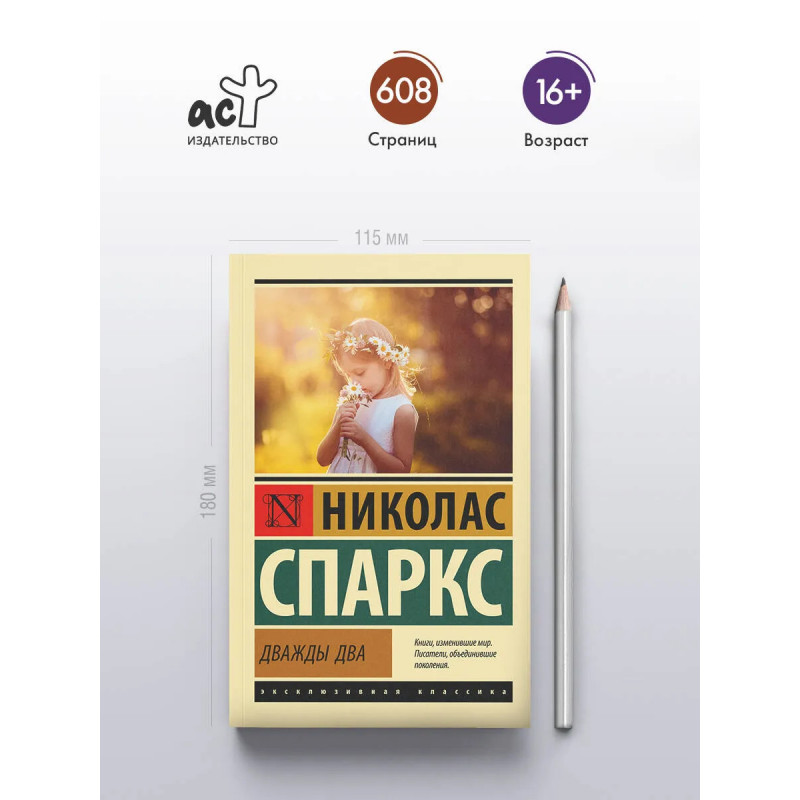 — От автора романов «Спеши любить» и «Дневник памяти». — Романы Николаса Спаркса переведены на 50 языков и разошлись по миру тиражом свыше 130 миллионов экземпляров. Писателя называют «главным романтиком современности», половина его книг экранизирована. — «Дважды два» — трогательная и пронзительная история о любви, семье и верности. — Издание в серии «Эксклюзивная классика» — в удобном формате и привычном оформлении.