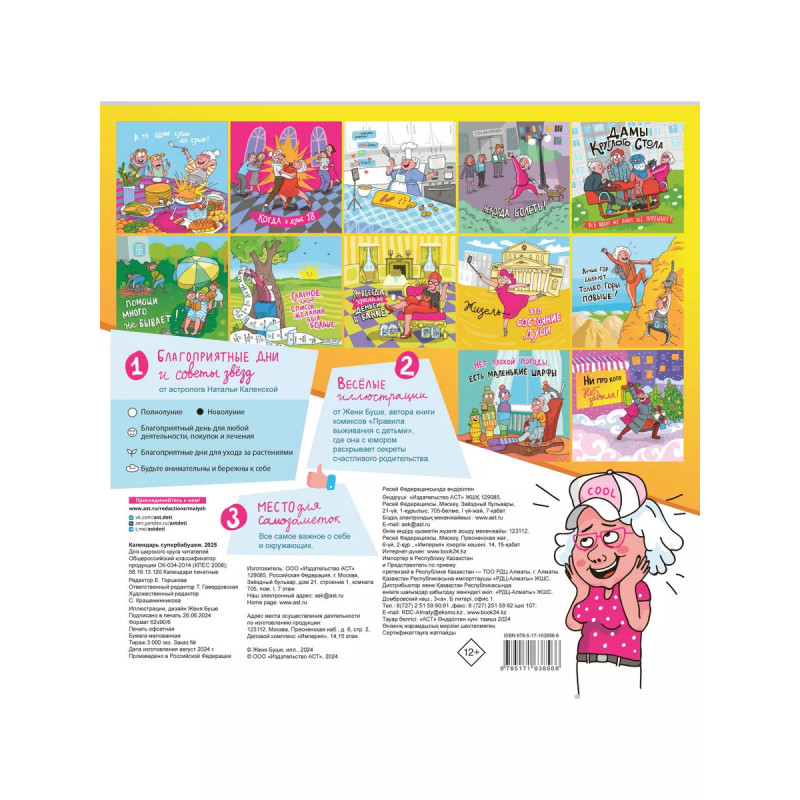 Кто самый главный человек в жизни после мамы? Конечно, бабушка! Поблагодарите своих любимых супербабуль за любовь, заботу и поддержку, за теплые слова и вкусные пирожки. И подарите этот веселый календарь-планер с вдохновляющими картинками, позитивными аффирмациями и советами астролога. Пусть весь год этот календарь поднимает настроение и напоминает бабушкам о бесконечной любви внуков.