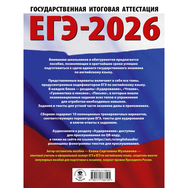 Вниманию школьников и абитуриентов предлагается пособие, позволяющее в кратчайшие строки успешно подготовиться к сдаче единого государственного экзамена по английскому языку. Представленные варианты включают в себя все темы, предусмотренные кодификатором ЕГЭ по английскому языку. В каждом блоке — разделы "Аудирование", "Чтение", "Грамматика и лексика", "Письмо", в которые вошли экзаменационные задания всех типов и упражнения для отработки необходимых навыков. Задания и тексты для устной части экзамена даны в приложениях. Сборник содержит 10 полноценных тренировочных вариантов, соответствующих параметрам ЕГЭ, тексты для аудирования и ключи-ответы к заданиям. К разделу "Аудирование" на сайте по размещены фонограммы текстов для прослушивания. Автор-составитель пособия – Елена Сергеевна Музланова – опытный учитель и официальный эксперт ЕГЭ и ОГЭ по английскому языку, создатель многих популярных пособий для подготовки к экзамену, лауреат премии Президента России.