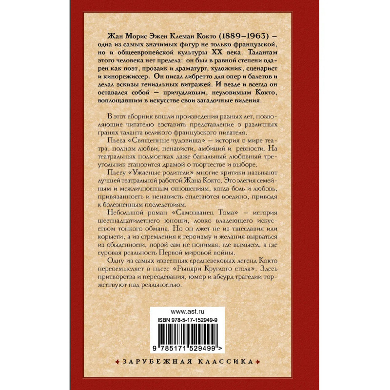 В этот сборник вошли произведения разных лет, позволяющие читателю составить представление о различных гранях таланта великого французского писателя. Пьеса «Священные чудовища» – история о мире театра, полном любови, ненависти, амбиций и ревности. На театральных подмостках даже банальный любовный треугольник становится драмой о творчестве и выборе. Пьесу «Ужасные родители» многие критика называют лучшей театральной работой Жана Кокто. Это элегия семейным и межличностным отношениям, когда боль и любовь, привязанность и ненависть сплетаются воедино, приводя к болезненным последствиям. Небольшой роман «Самозванец Тома» – история шестнадцатилетнего юноши, ловко владеющего искусством тонкого обмана. Но он лжет не из тщеславия или корысти, а из стремления к героизму и желанию вырваться из обыденности, порой из сам не понимая, где вымысел, а где суровая реальность Первой мировой войны. Одну из самых известных средневековых легенд Кокто переосмысляет в пьесе «Рыцари круглого стола». Здесь притворства и переодевания,