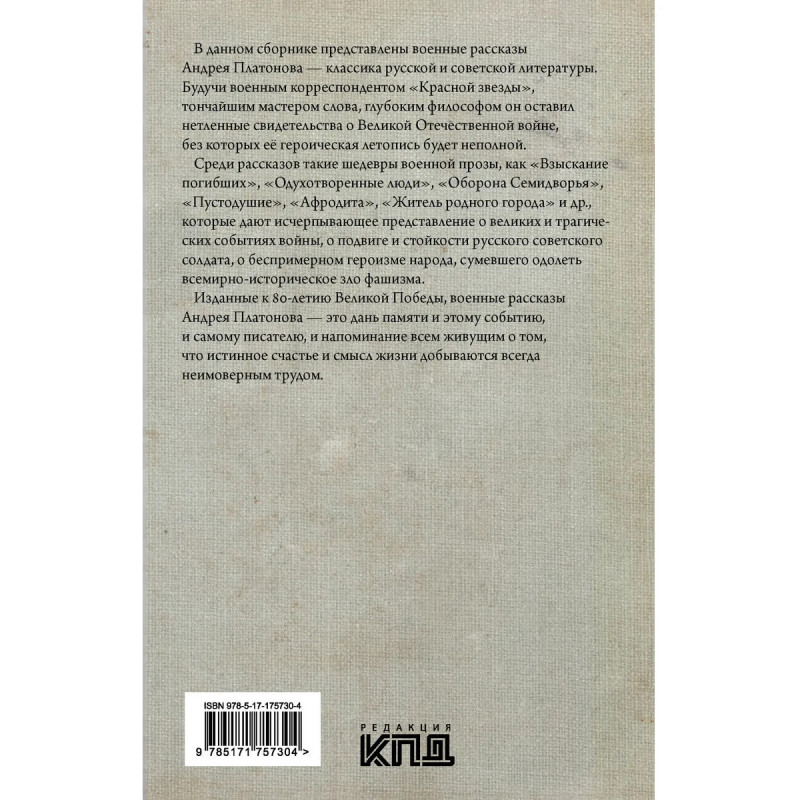 - Новинка редакции «КПД» (Колобродов, Прилепин, Демидов) специально к 80-летию Победы в Великой Отечественной войне! - Сборник малой военной прозы от автора, работавшего фронтовым корреспондентом всесоюзной газеты «Красная звезда». - В книгу вошли культовые рассказы: «Взыскание погибших», «Одухотворенные люди», «Оборона Семидворья», «Пустодушие» и другие. - Серия «Знамя Победы».