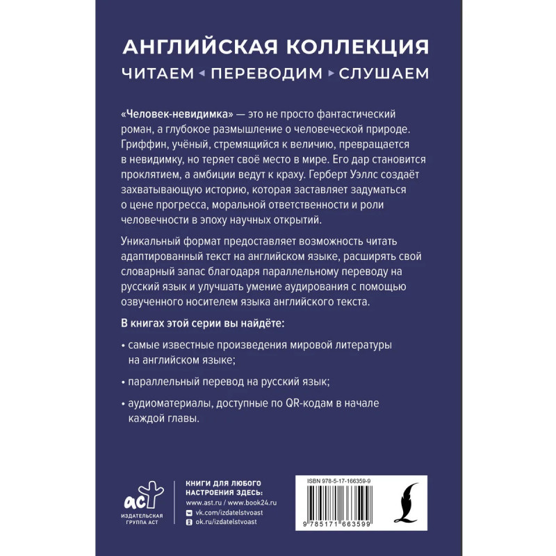 Переда вами известный роман Герберта Уэллса "Человек-невидимка" – увлекательная история безумного и гениального ученого, совершившего удивительное открытие. Адаптированный английский текст и перевод на страницах одной книги помогут легко познакомиться с лучшими произведениями мировой литературы и выучить английский язык с удовольствием. Благодаря параллельным текстам вы быстро расширите свой словарный запас, а также усвоите употребительные грамматические конструкции и устойчивые выражения. Английский текст полностью озвучен носителем языка и бесплатно доступен для прослушивания по QR-коду, расположенному в начале каждой главы. Издание адресовано всем, кто хочет совершенствовать свои знания и читать литературу на языке оригинала.