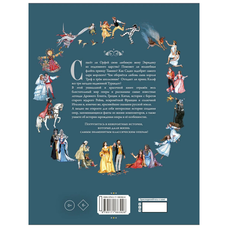 Cпасёт ли Орфей свою любимую жену Эвридику из подземного царства? Поможет ли волшебная флейта принцу Тамино? Как Садко задобрит самого царя морского? Чем обернётся любовь сына короля Треф к трём апельсинам? Отгадает ли принц Калаф все три загадки надменной Турандот? В этой уникальной и красочной книге отражён весь блистательный мир оперы и рассказаны самые известные легенды Древнего Египта, Греции и Китая, истории с берегов старого мудрого Рейна, искромётной Франции и солнечной Италии и, конечно же, красивейшие сказания русской земли. А заодно вы откроете для себя интересные истории создания опер, запоминающиеся факты из жизни композиторов, а также узнаете об истории зарождения оперы и её особенностях. Погрузитесь в невероятные истории, которые дали жизнь самым знаменитым классическим операм!