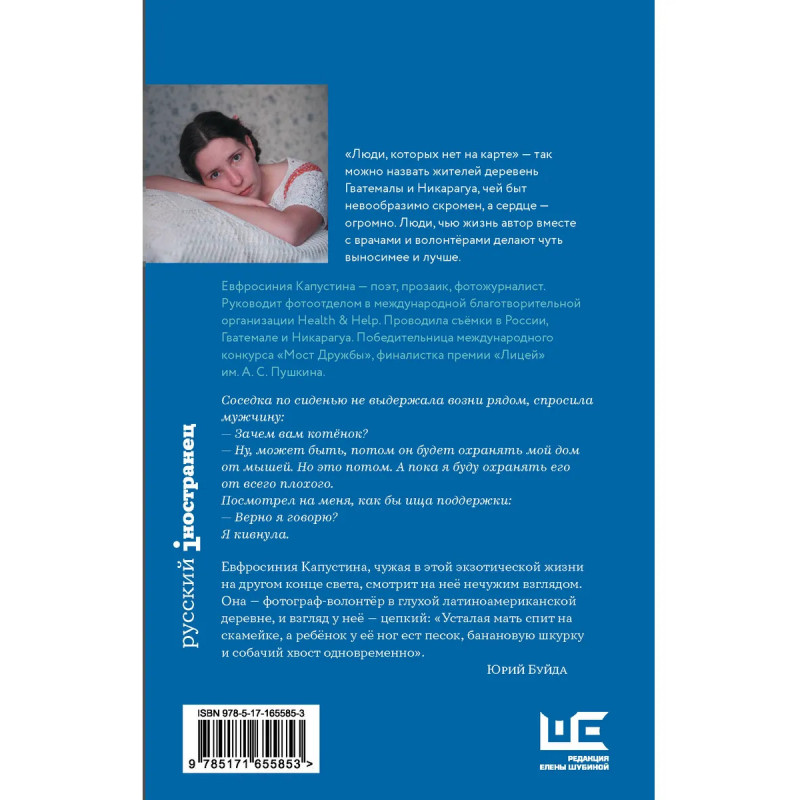 Люди, которых нет на карте так можно назвать жителей деревень Гватемалы и Никарагуа, чей быт невообразимо скромен, а сердце огромно. Люди, чью жизнь автор вместе с врачами и волонтёрами делают чуть выносимее и лучше.Евфросиния Капустина поэт, прозаик, фотожурналист. Руководит фотоотделом в международной благотворительной организации Health Help. Проводила съёмки в России, Гватемале и Никарагуа. Победительница международного конкурса Мост Дружбы, финалистка премии Лицей им. А.С. Пушкина.Евфросиния Капустина, чужая в этой экзотической жизни на другом конце света, смотрит на неё нечужим взглядом. Она фотограф-волонтёр в глухой латиноамериканской деревне, и взгляд у неё цепкий: Усталая мать спит на скамейке, а ребёнок у её ног ест песок, банановую шкурку и собачий хвост одновременно (Юрий Буйда).