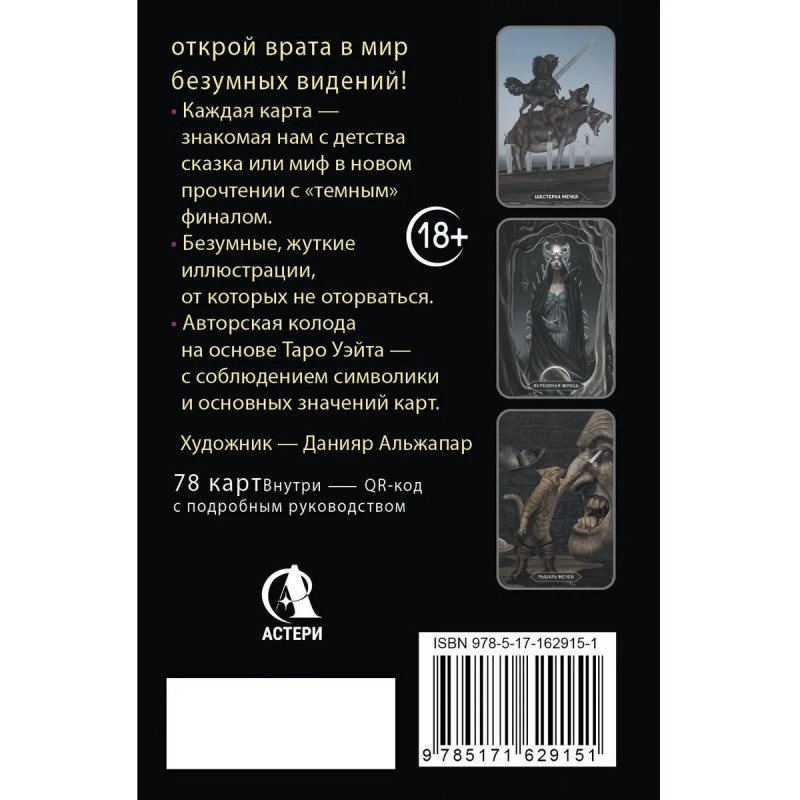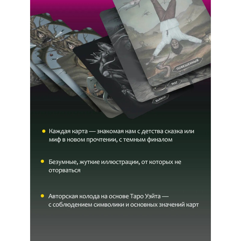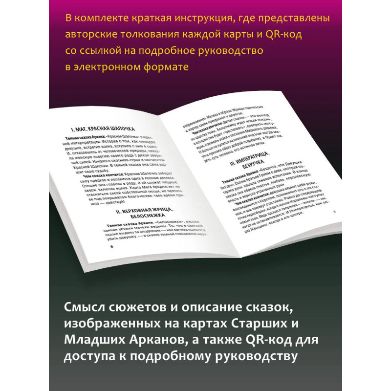 Это колода, которая предлагает заглянуть на другую сторону реальности, где ответы надо искать в тенях. Каждая карта — отдельная темная сказка, ведущая к глубокому древнему знанию, скрытому внутри каждого из нас. Образы знакомых с детства персонажей становятся проводниками в мир внутренней тьмы, помогая прожить скрытые эмоции и открыть сокровенные истины.