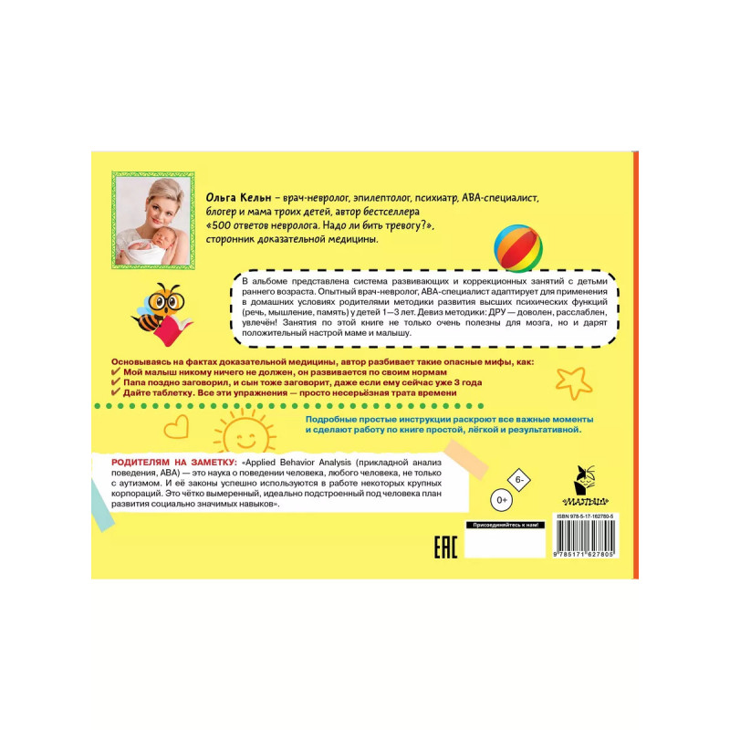 Как помочь малышу развиваться безопасно и гармонично? На какие нормы развития ориентироваться? Всегда ли нужны таблетки? Ольга Кельн врач-невролог, эпилептолог, психиатр, ABA-специалист, блогер и мама троих детей, автор бестселлера 500 ответов невролога. Надо ли бить тревогу?, сторонник доказательной медицины отвечает на самые важные вопросы родителей, разбивает опасные мифы и помогает запустить речь малыша. В альбоме представлена система увлекательных развивающих и коррекционных занятий с детьми раннего возраста, а также подробные подсказки для родителей. Последовательные и простые инструкции сделают работу по книге простой, легкой и результативной. Эта книга станет для вас главной помощницей, передаст бесценные знания о нормах развития и методах обследования, а также подарит положительный настрой вам и вашему малышу. Лучший подарок для заботливых родителей!