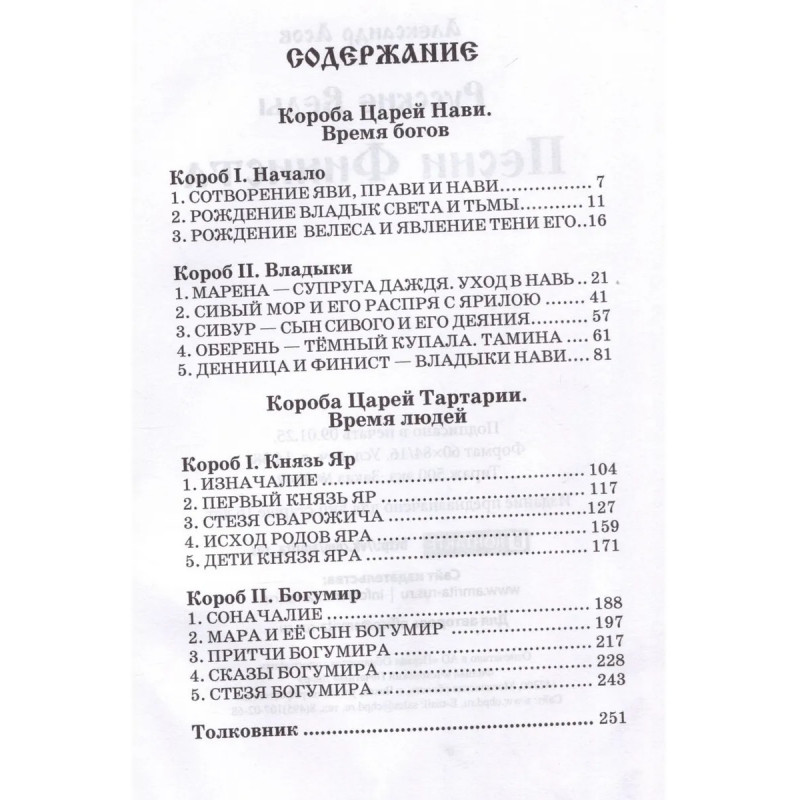 Книга являет собой свод русских преданий о богах и царях Нави, о Финисте Ясном Соколе, ставшем стражем Ирийских врат. Также здесь публикуются легенды о Первом князе Яре и о царе Тартарии Богумире. Согласно традиции берендеев, эта книга хранится в невидимом граде Китеже. Записана она братом Буса Белояра – Кудеяром.