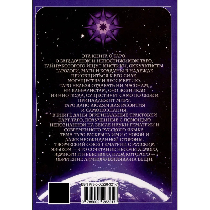 Эта книга о ТАРО, о загадочном и непостижимом ТАРО, представшим перед земным человечеством в виде символических и аллегорических карт. Тема ТАРО представляет собой один большой вопрос даже своим загадочным названием, но благодаря Гематрии раскроется с новой, и даже неожиданной стороны. Тайну ТАРО ищут мистики, оккультисты, тарологи, масоны, маги и колдуны, а также члены тайных обществ, в надежде приобщиться к его силе, могуществу и бессмертию. О ТАРО написаны тысячи книг на многих языках Мира, почти ни на шаг не приближающие к пониманию его тайны. Неясным остаётся и смысл самого непереводимого слова — ТАРО, не имеющего ни родины, ни национальности. Что же такое ТАРО, какую роль играет оно в современном Мире, какие Силы стоят за ним, какие энергии оно несёт, и, наконец, какие возможности открывает? Все эти безответные вопросы будут заданы всезнающей космической науке — Гематрии.